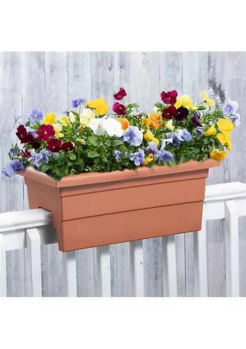 The Country Side Railing Planters are constructed with a high-grade plastic blend and are proudly made in the USA. The planters contain a versatile design complete with a matte finish, and a layered exterior. These railing flower boxes are constructed to be durable, fade-resistant and sturdy, so you can trust they won�t fade or become brittle from being exposed to the sun. They can be placed on either 2?x 4? or 2?x 6? railings on your porch, deck, or balcony � and there are no tools or drilling required! Once you add the soil and plants of your choosing, the planters will stay put on the railing!